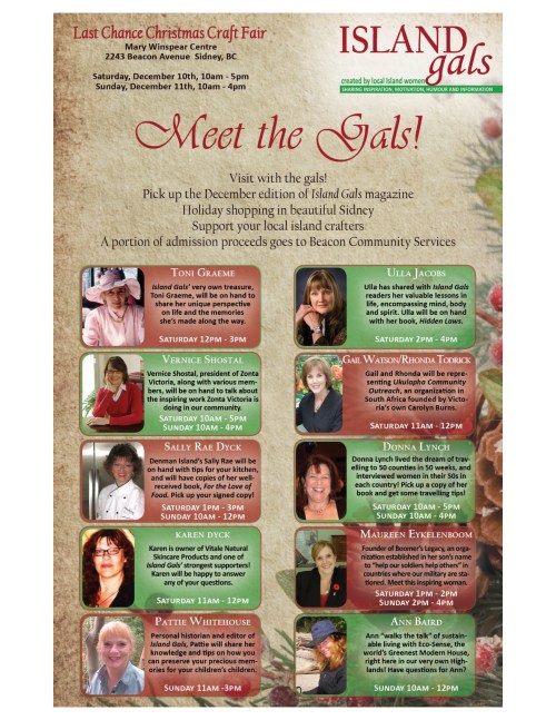 Meet the Island Gals at the Last Chance Craft Fair in Sidney this weekend. I’ll be there on Sunday from 10-noon. Come on out and ask me questions about Green building and sustainable living…or just come to say Hi.