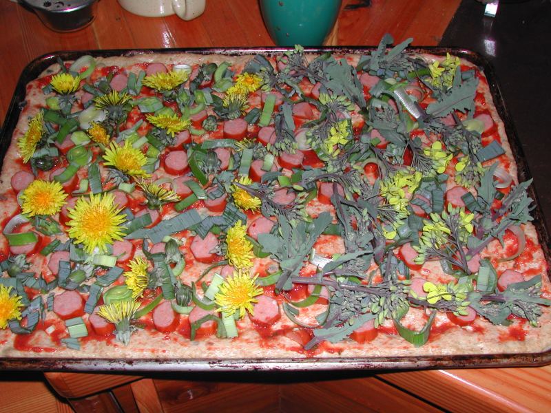 Pizza in the cob oven. Yes, those are dandelions. YUMMY!