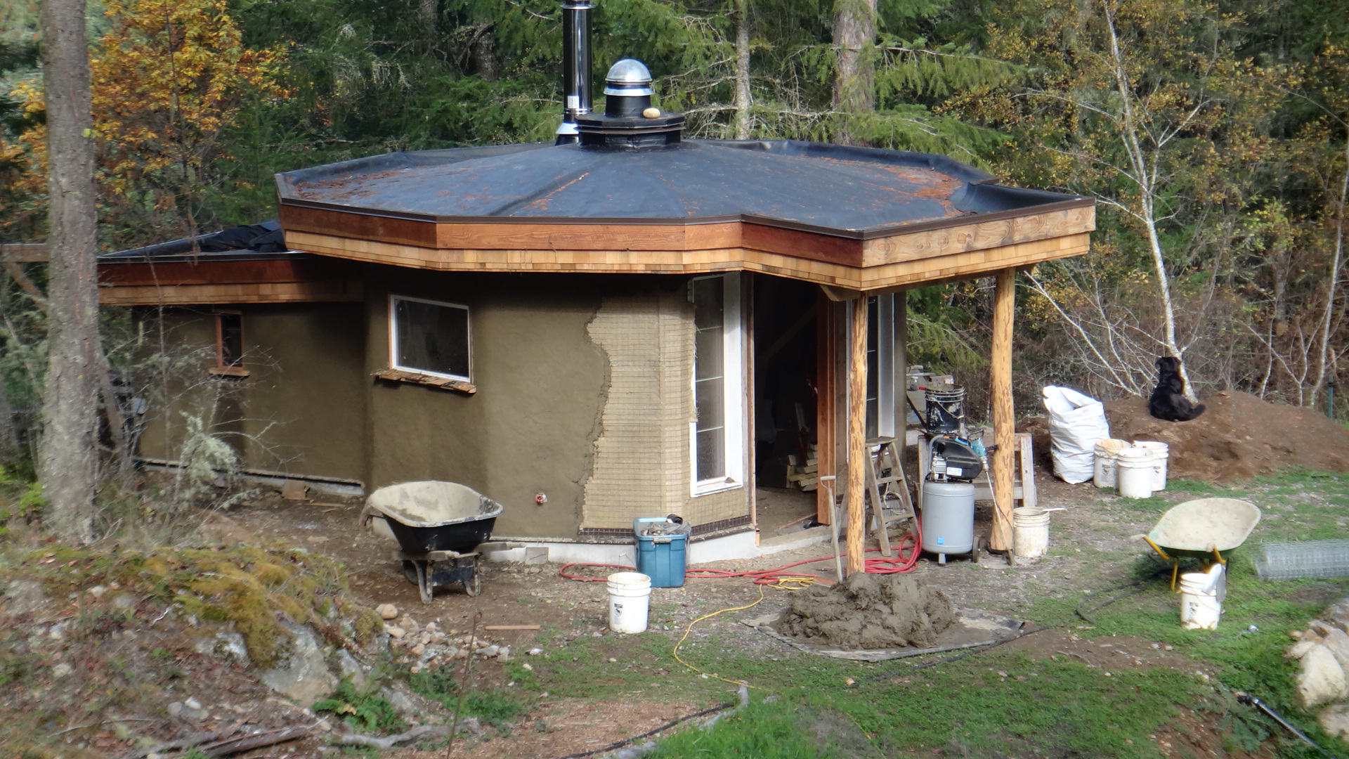 What’s an Eco-Hut?  The sustainably built Eco-Hut, located by the refurbished old pond, is the new office for our farm resilience business.  This off-grid solar-powered natural building is about 130 sqft plus a sleeping nook.  It is totally self-contained and we may even move in there when the kids are grown.  We like to think of it as our retirement home.  Anyone interested in the small home movement will certainly love this space.