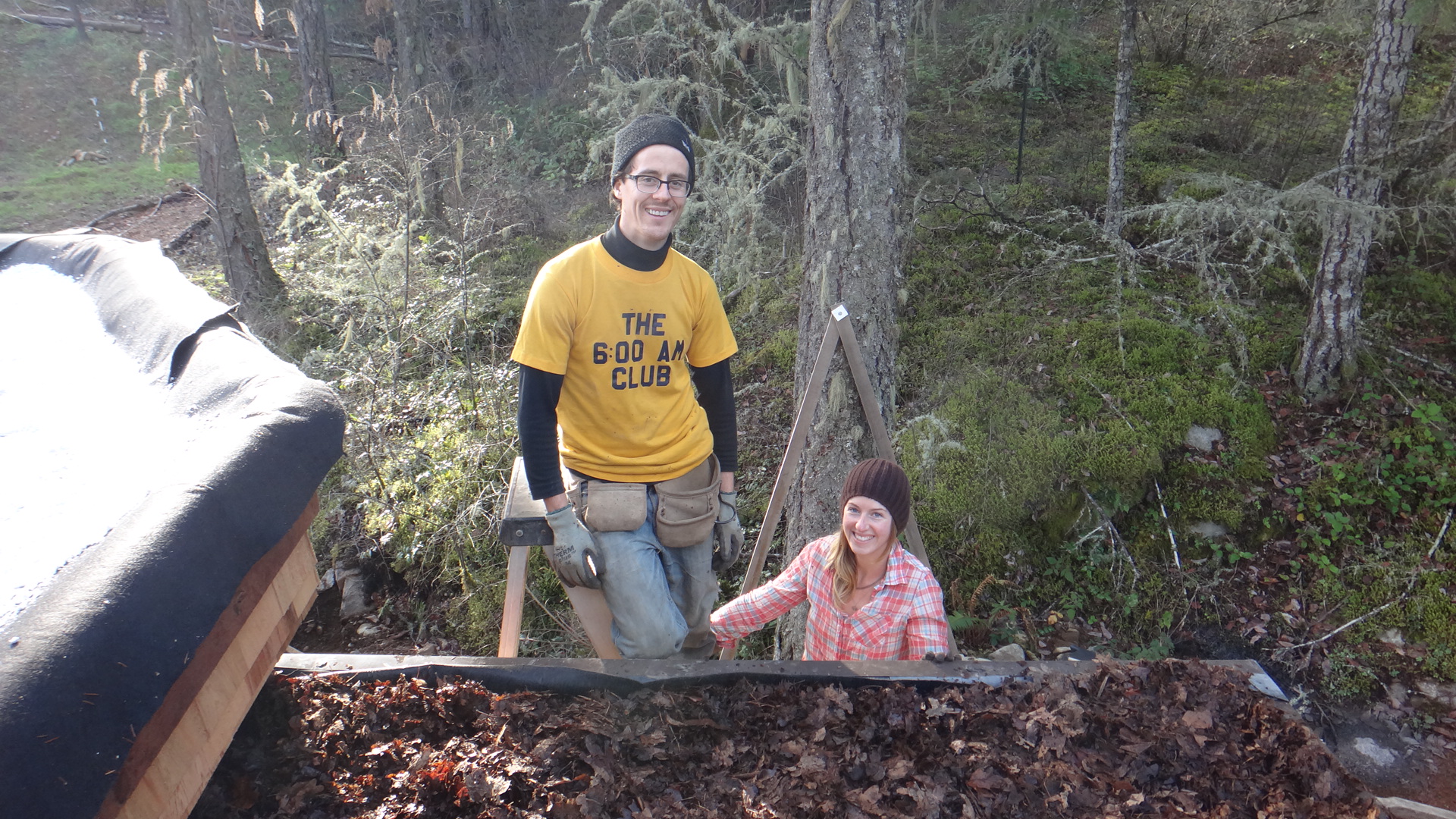 Tayler and Solara from Hatchet & Seed helping to install living roof layers on the new Eco-Hut.