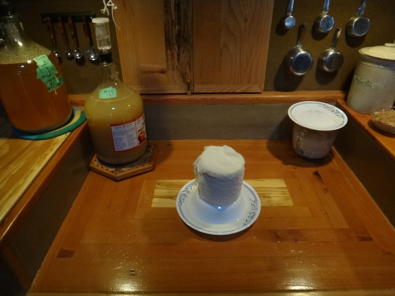 Ginger beer brewing, home made cheese aging on counter, oats and brown rice fermenting on counter.