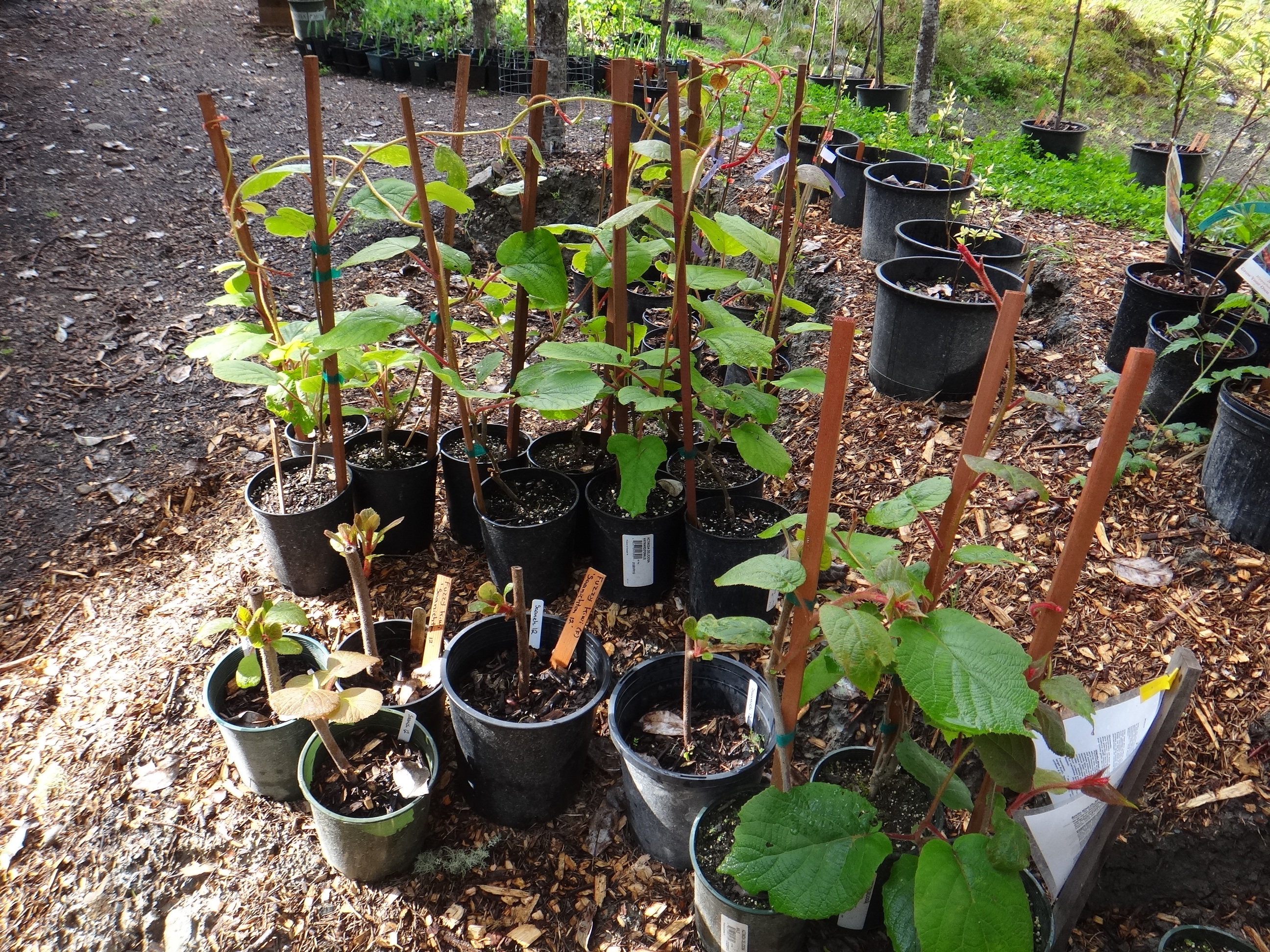 These are not sour at all and make great eating cherries. They are self fertile, grow to only 7-8ft tall, and are very beautiful plants. Perfect backyard plant. We have Valentine, Romeo, Cupid, and Juliet. (notice the theme here?). Our Honeyberries are looking excellent and they have flowers on them. We have 5 types as pollination pairs are required. We also have lots of Fuzzy Kiwi both male and female,