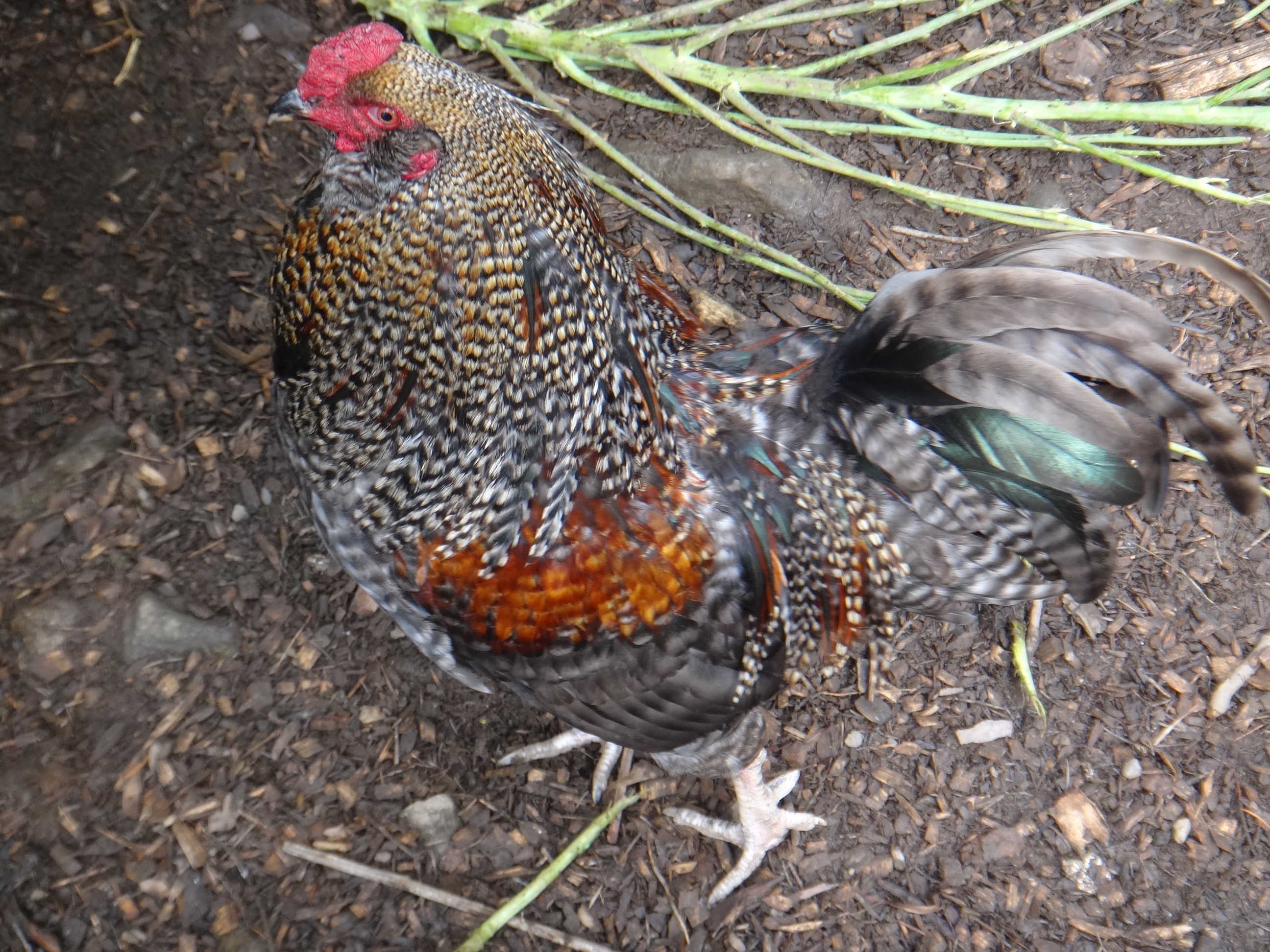 This is Henopause…have we ever mentioned our very old chicken? She is about 6 years old and went through a very NASTY feather moult 2 years ago…thought she would die. But instead, she grew new feathers and now looks just like a rooster.