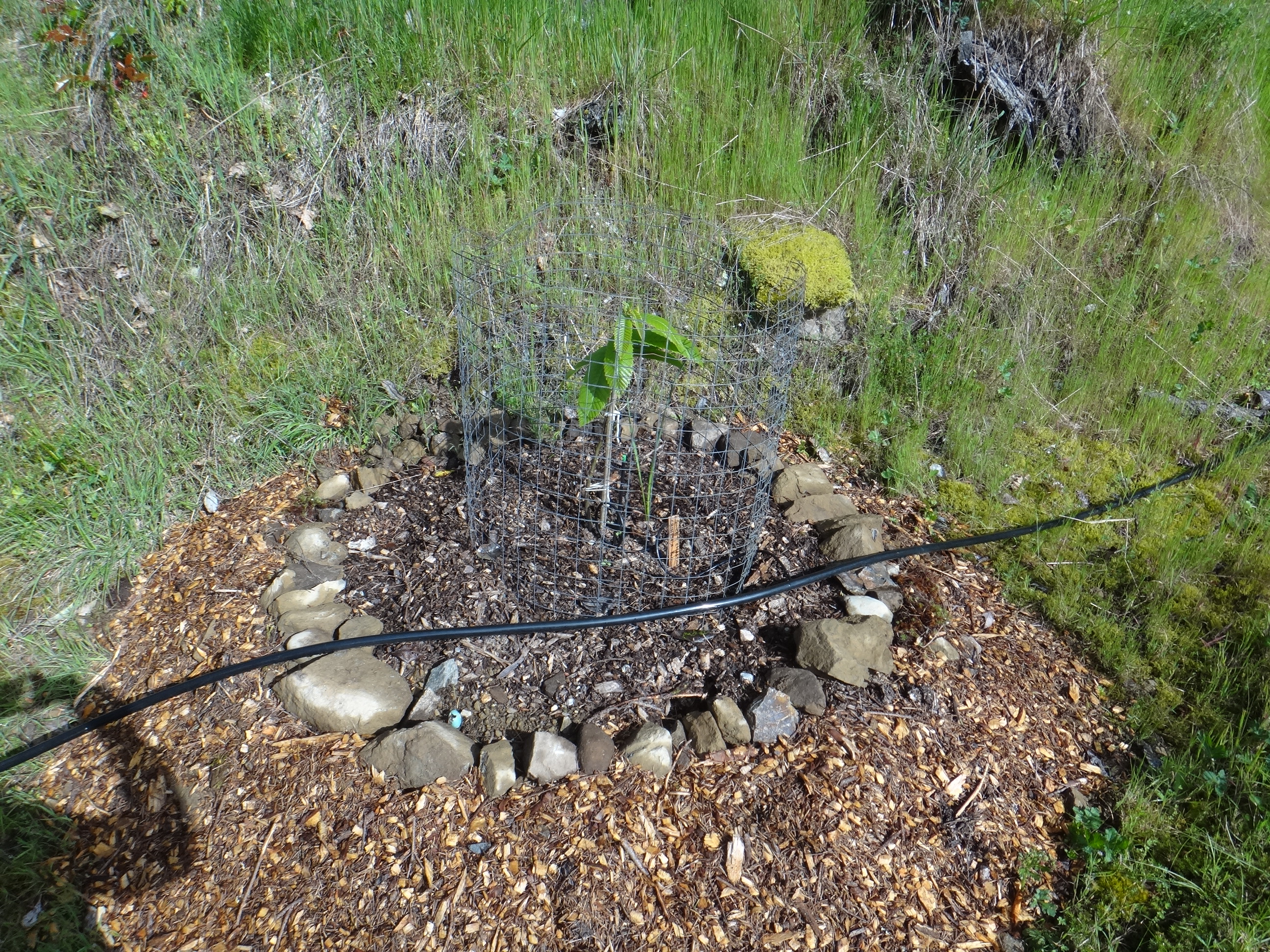 Food security: We take this topic seriously…one only has too look at what’s happening in California to know that water and food are going to be one of the key issues of our time. This is why we are planting food forests and especially more chestnuts. We have an old logging road that runs east to west on our south slope…PERFECT location to plant chestnuts on the upward side of the old road. We’ve planted five more…I think we have 12 trees now. They are irrigated with gravity fed rain water to get them going…once established they are very draught tolerant. These are an ideal high protein food source for people, chickens, pigs, etc.