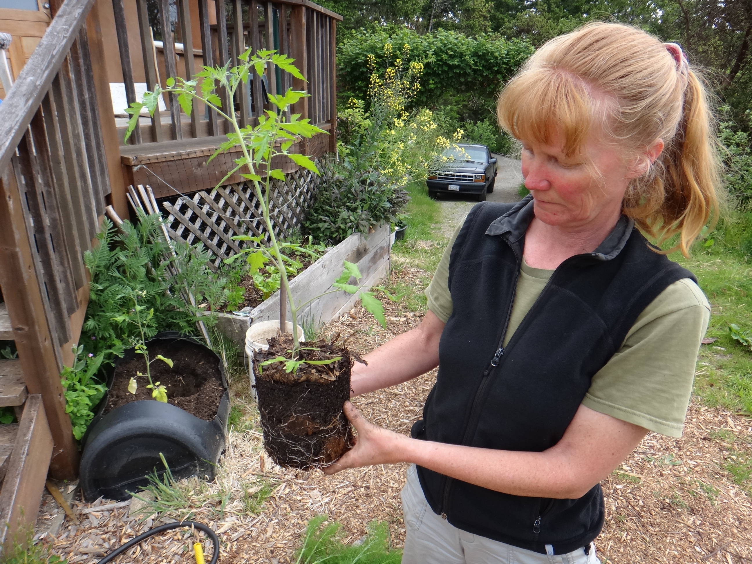 This week. We have lots of heritage tomatoes started from seed…Black Early, Black Prince, Black Plum, and Galena yellow cherries. All doing extremely well in 1-gal pots and some even flowering (all potted up with lots of composted goat bedding manure – wonderful root structure). Gord and I didn’t communicate very well and Gord thought that I hadn’t been able to find any Black Heritage tomatoes…so he ordered a big pack of Black Brandywine tomatoes…So, consequently we have lots for sale. He also wanted to make sure we got some hot Habanero peppers…so we have some of those for sale too. (As we proof read this on Friday we can say we have tomatoes already setting).