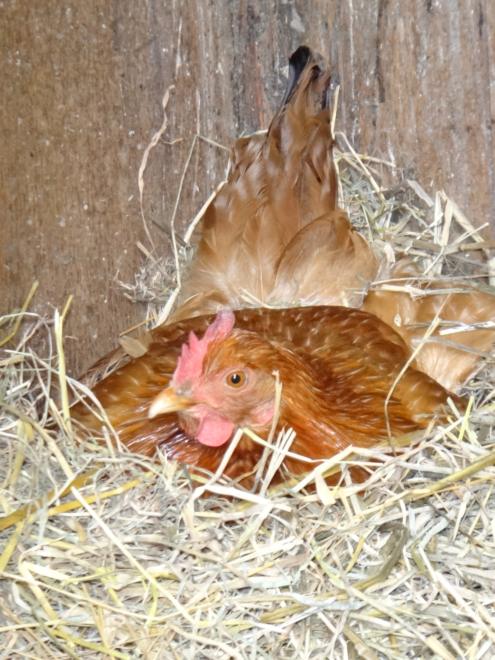 Chickens. Still no little chicks…first batch nothing happened, we don’t think the momma hen was turning the eggs. Second batch due today…fingers crossed. Momma hen #2 kept allowing other hens to come in and lay more eggs…OMG there are 16-18 eggs under her. She has been doing a great job and sits with her wings out holding all the little eggs, but they will hatch at different times. After the first 8-10 hatch Gord said he will take the rest of the eggs to the lower greenhouse to put on bottom heat since they likely will have another week to go. I had marked the original 10 eggs with a pencil, but all the turning has rubbed off my marks. Live and learn.