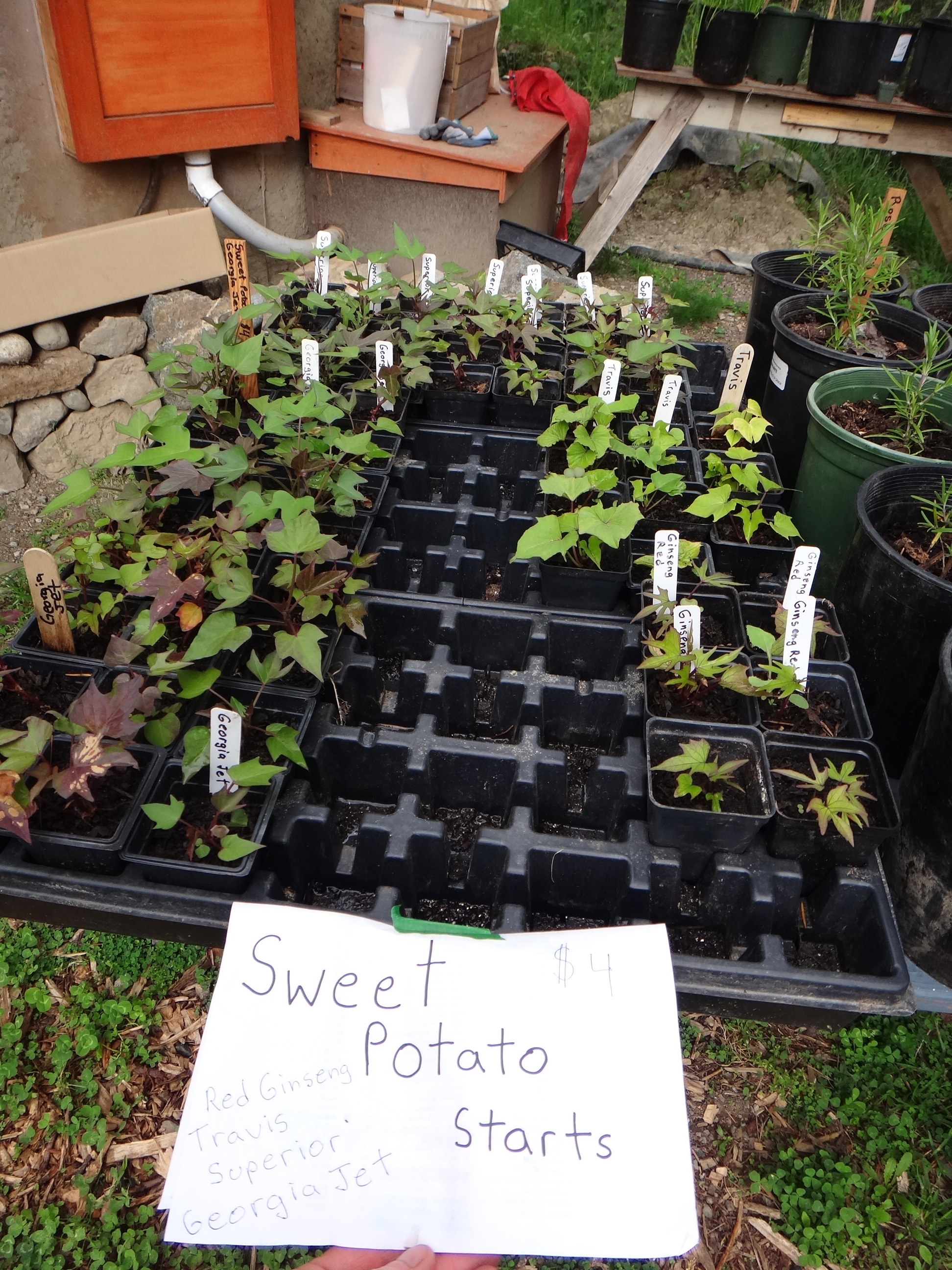 What plants to stock? It’s been an ongoing challenge to try and figure this out and to stock our nursery with what people are looking for. There seems to be no predicability or patterns in what people buy. For instance, early in the season it was hard to keep up to the sales of sweet potato slips…now, it’s finally warm enough to put them out and last week, we didn’t sell a single one. Anyways, we are now fully stocked with all four types of sweet potato slips. Last year we sold out of some plants very early…so this year we stocked up on these same items…it seems the trends change rapidly.- Scarcity. Seems we only need to mention that we have only 1 or 2 of something and boom…it’s sold. So in light of that…we are almost sold out of everything. Just kidding.