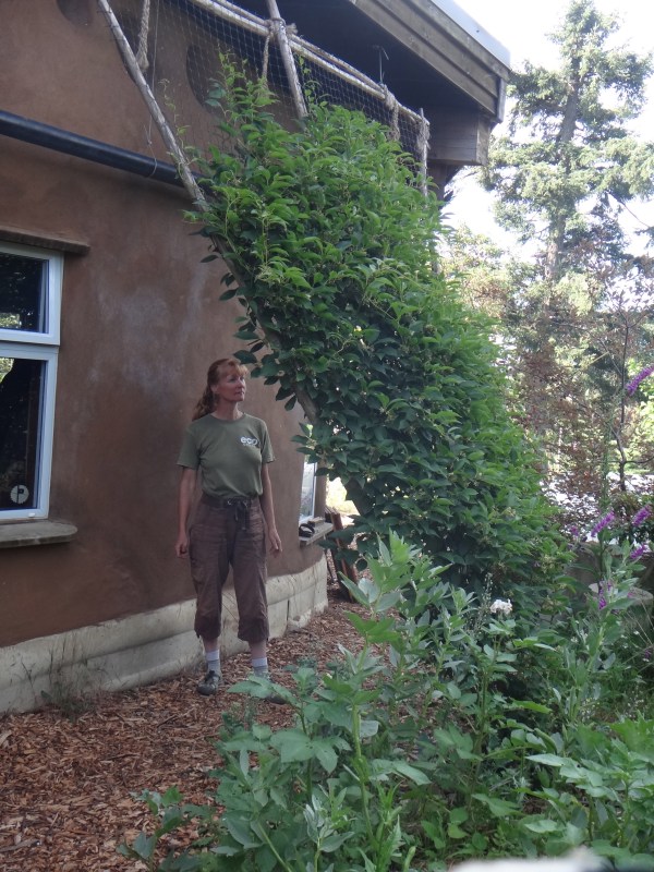 Ann admiring the passive solar feature on the west side of our house – The HARDY KIWI. Highly productive food producing vine grows well in half sun