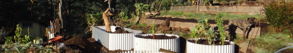 Annual beds: 8 years ago when we lived in the trailers, we terraced the hillside with cedar raised garden beds…and yup, they are now falling apart…after about two years of brainstorming solutions that would last our lifetime, be affordable, and make it easier to garden as we get old, we came up with the GALVALUME beds. This is a very heavy gage material that we get pressed on the mainland, AND is water potable certified (will not leach lead or cadmium.) We have now installed three of these…one 4ft round, one 5 ft round and one rectangular 10ft x 4ft bed that can have a cold frame/greenhouse cover easily installed. We will have one round 4ft bed (2 ft deep) for sale this week at $190.
