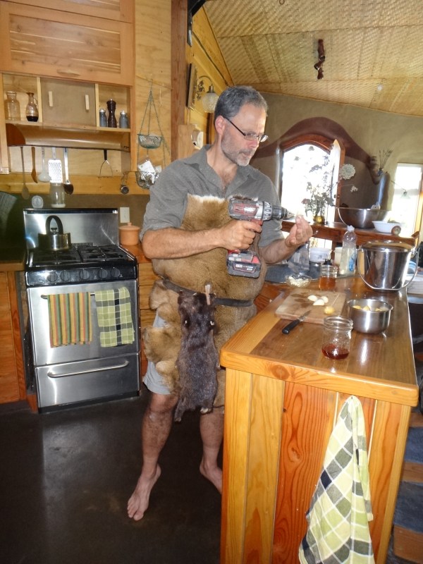Gord helping in the kitchen drilling kebobs, wearing his manpron (man apron). And yes that is a mink pelt hand towel.