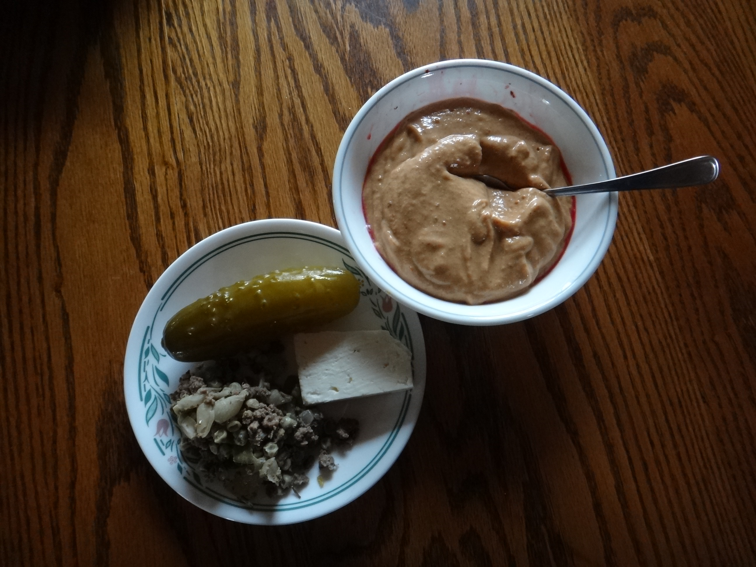 Smoothy (Squash, egg, goat milk, apple, fig), Pickle, cheese, Venison (peas, onions, garlic, rosemarie)
