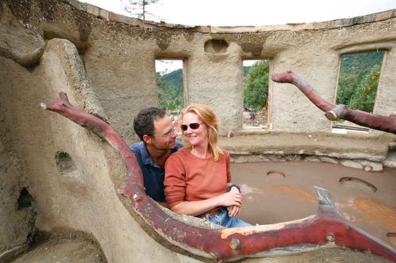 VICTORIA, BC (July 19, 2007) – Ann and Gordon Baird sit on the built-in benches of their new living room inside their half-constructed dream home made of cob, a centuries-old building technique using clay, sand, and straw, near Victoria, BC. Their non-toxic earthen house will be equipped with solar panels, radiant floor heating, wind generators and a green roof to filter rain water. (Photo by Deddeda Stemler for Adriana Barton story)