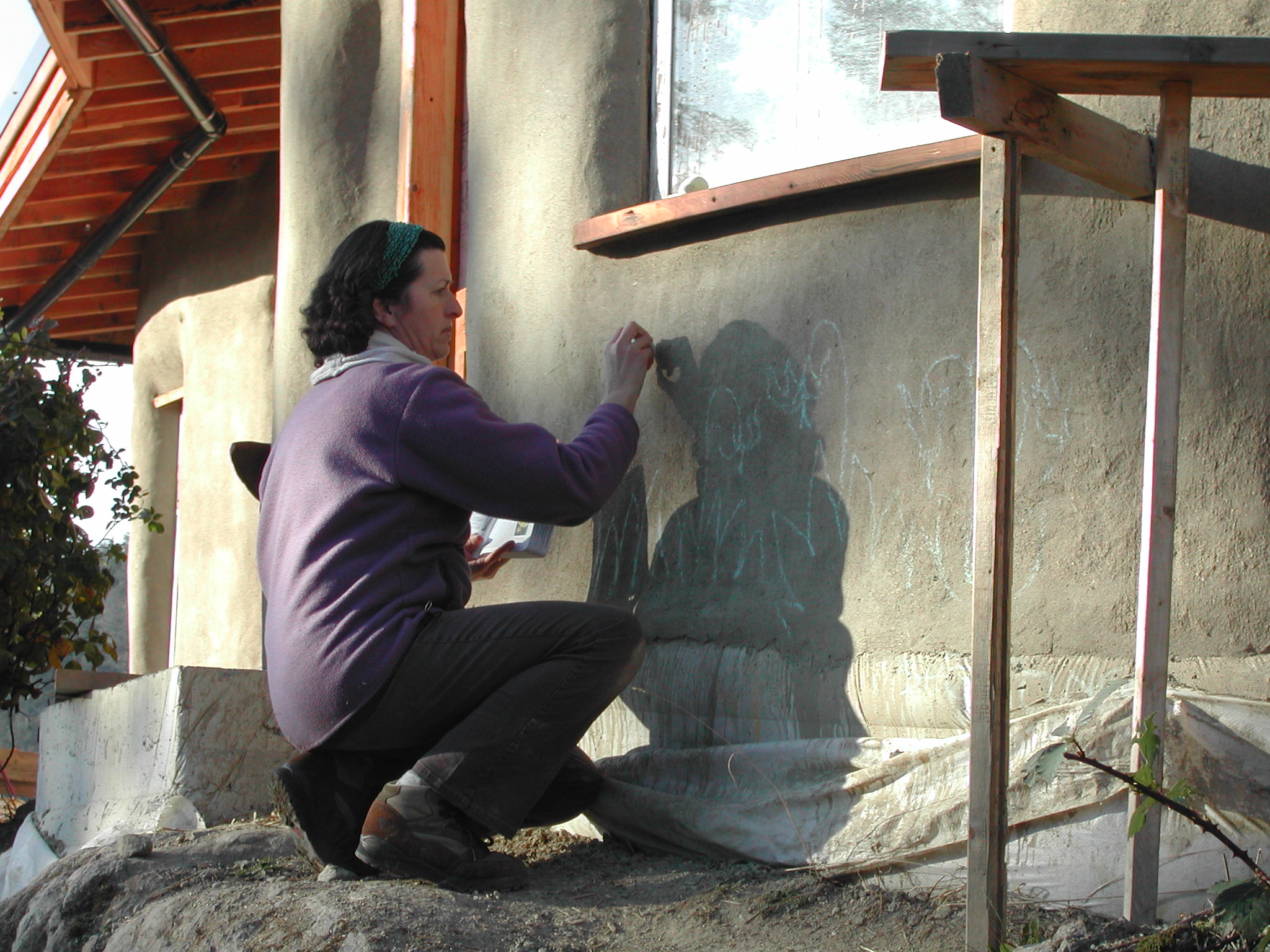 Angela drawing beautiful creatures on our cob home during one of her visits