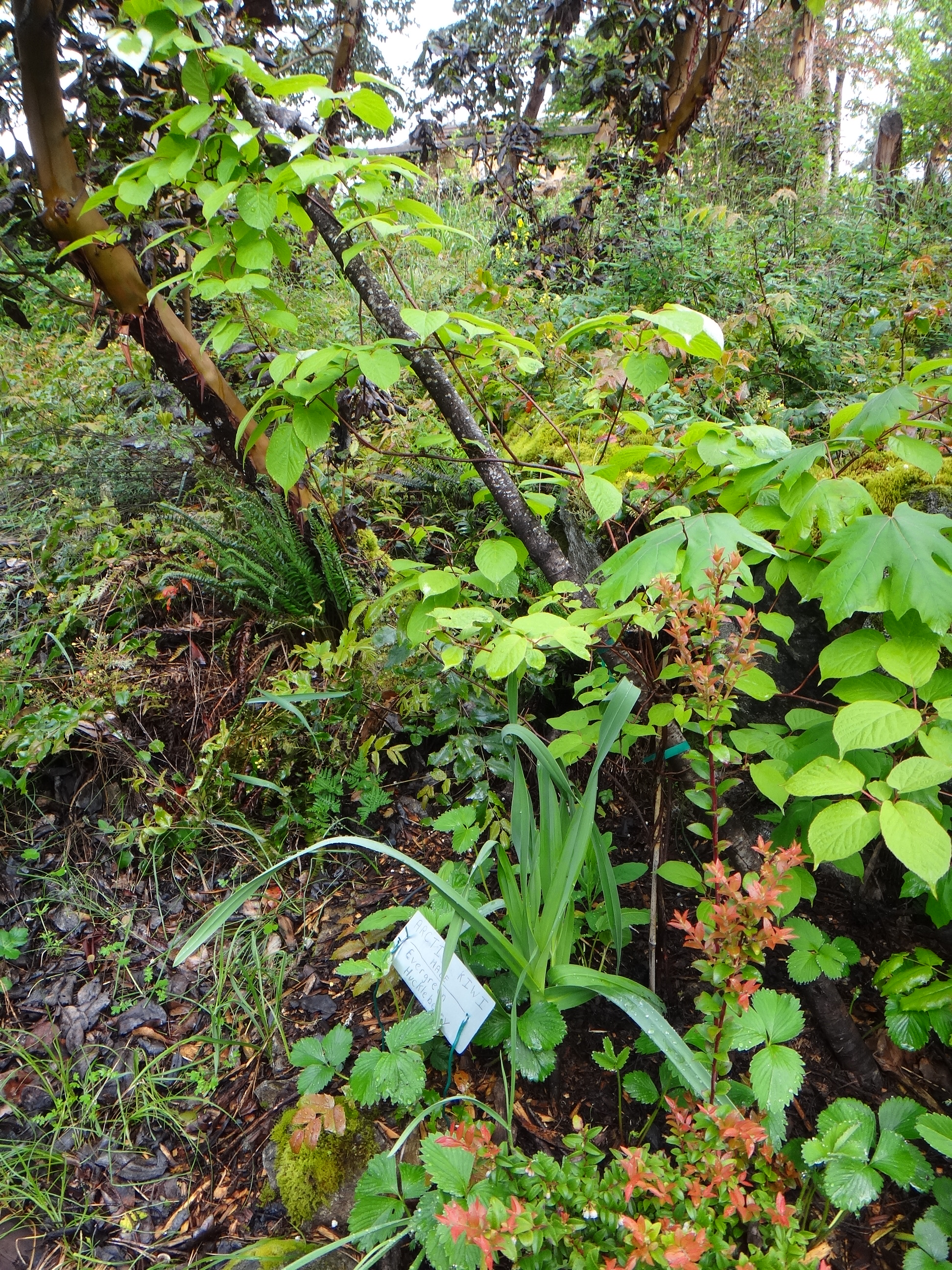 Arctic kiwi planted with perennial Leek, strawberries, and evergreen huckleberry