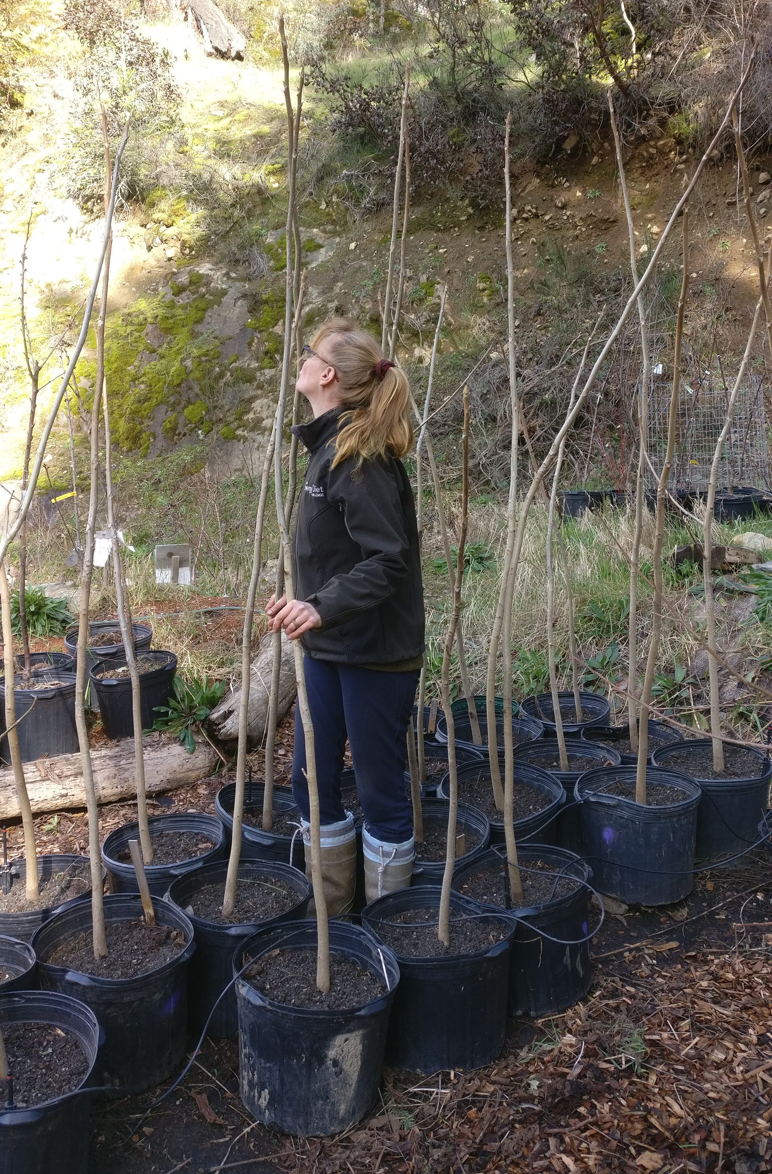 Ann doing her impression of a tree-hugger – kissing our Heartnut Walnut trees