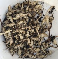 Ground Nut – Apios americana (tubers). (I have 30 tubers for sale). These are very tasty and filling small tubers. We love them steamed with butter. Very high in protein. Nitrogen fixing. These vines grow about 1 meter tall and need something to climb. Crop takes about two years to establish the bed. They can be grown in a food forest setting, but we also like to dedicate a raised bed just to these so that harvest is easier…tubers can travel quite a ways. Tubers form on the roots in shallow soil like strings of pearls about 1-3 inches apart. Pink/purple flower clusters are beautiful and last a long time.