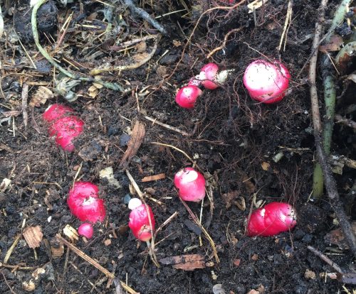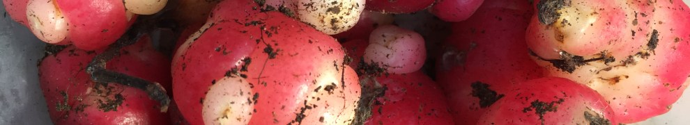 Oca (tubers): These beautiful pink and white tubers are our favourite. The greens look like clover. The tubers are harvested after the greens totally die down and these mushy tops are used as a thick mulch to protect the tubers from freezing. Colder climates will be different than the coast. Tubers must be protected from freezing with a heavy mulch as they are quite shallow. I grow ours in a raised bed to help keep out the voles as these tubers are delicious for them as well. They are not actually potatoes and they can be eaten raw or cooked. They cook quicker than potatoes and do well with steaming.