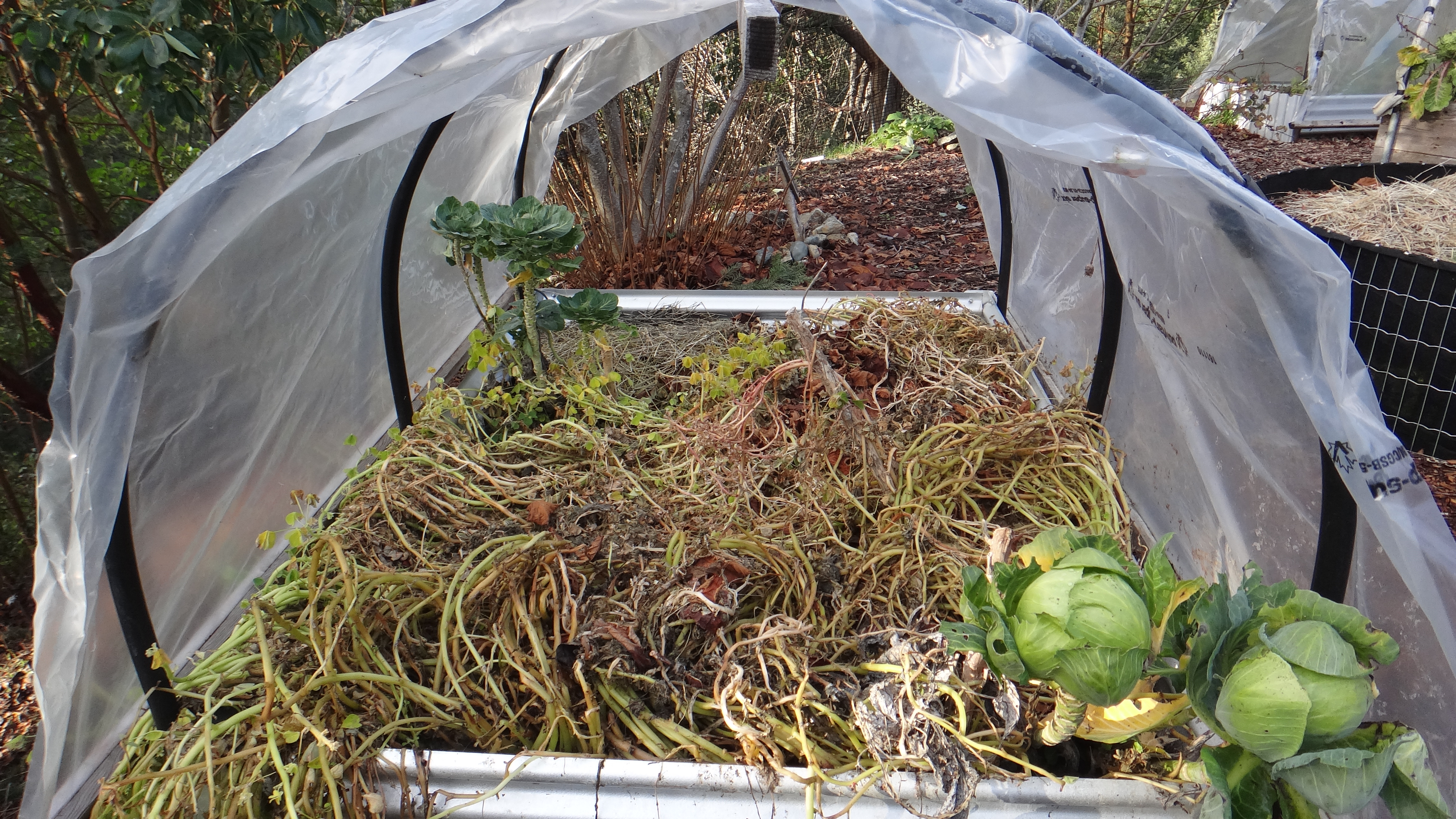 Plants have died down and mushy mass piled on top of the bed. Ready for harvest when tops fully wilted. Leave some small tubers behind for next years plants. Make sure well mulched for winter.