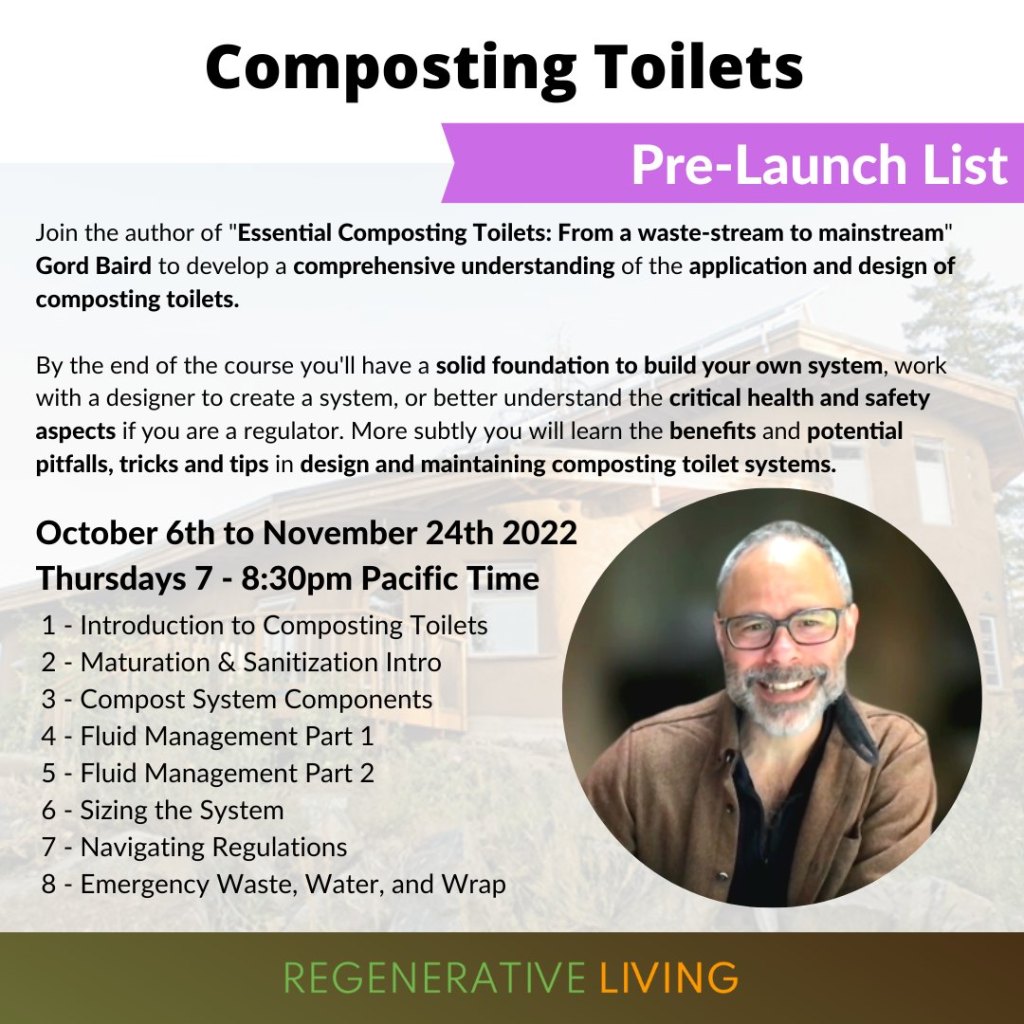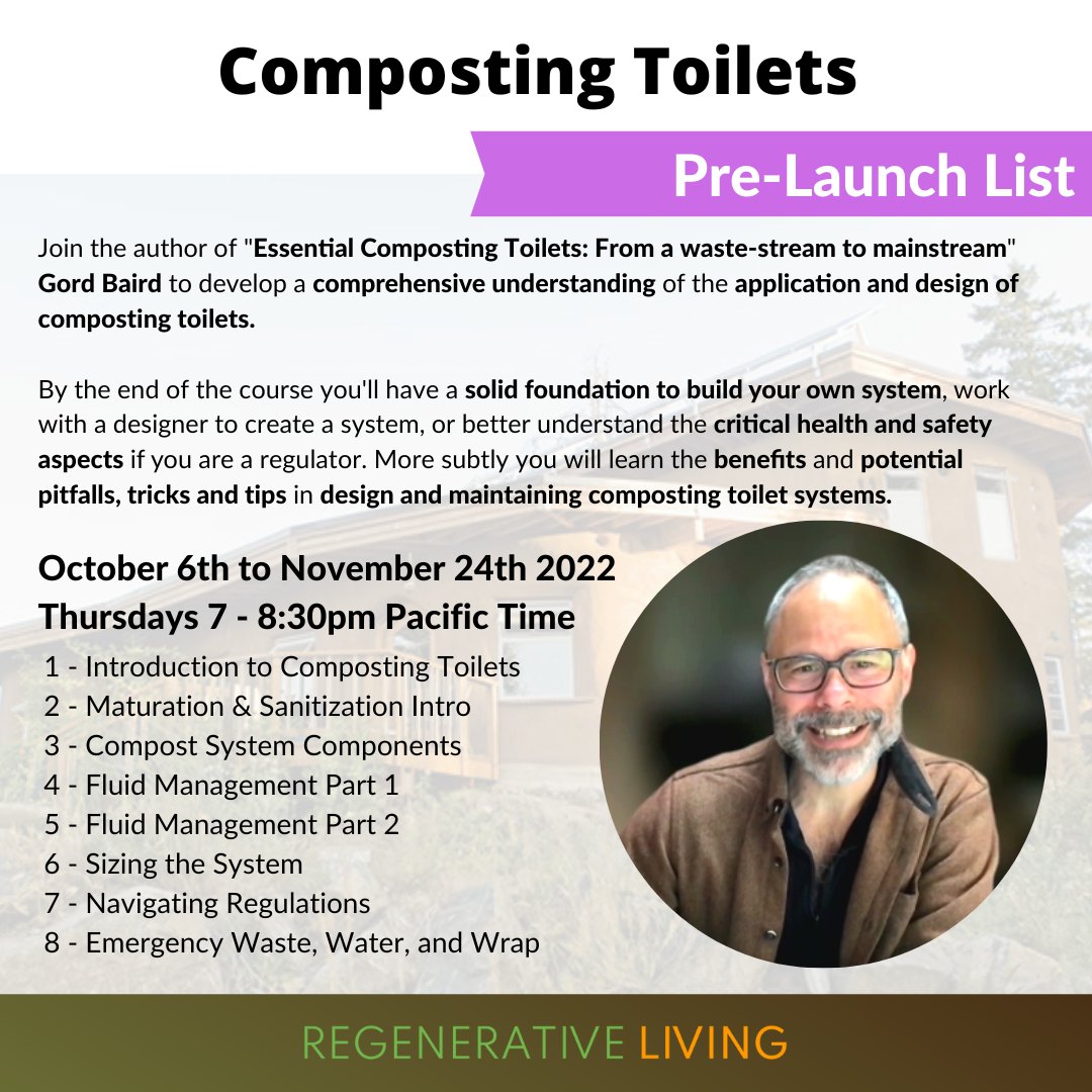 Javan Bernakevitch, of All Points Design, has been pleasantly and persistently persuading Gord to develop a series of three online workshop series starting with an 8 session class on compost toilets, followed by a 4 session class on grey water, and a 4 session class on rainwater from October 2022 into June 2023.