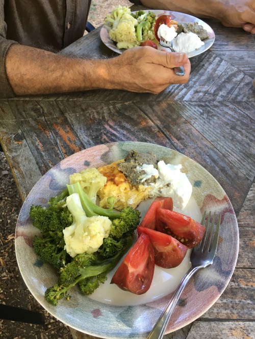 A quick and colourful dinner from the garden. Scrambled eggs, beans with garlic, thick yogurt, tomato, broccoli and cauliflower.