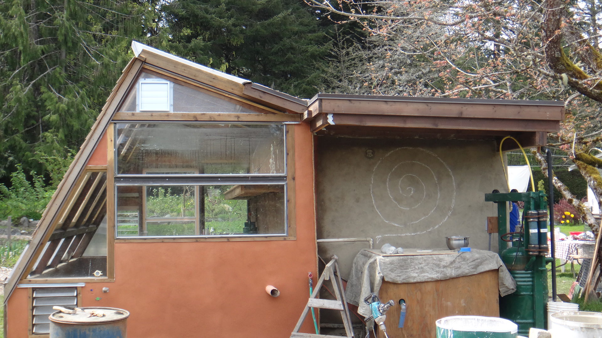 The McPerson/Philip greenhouse/rootcellar. The south portion is the greenhouse, the north is a cob cold storage with living roof.
