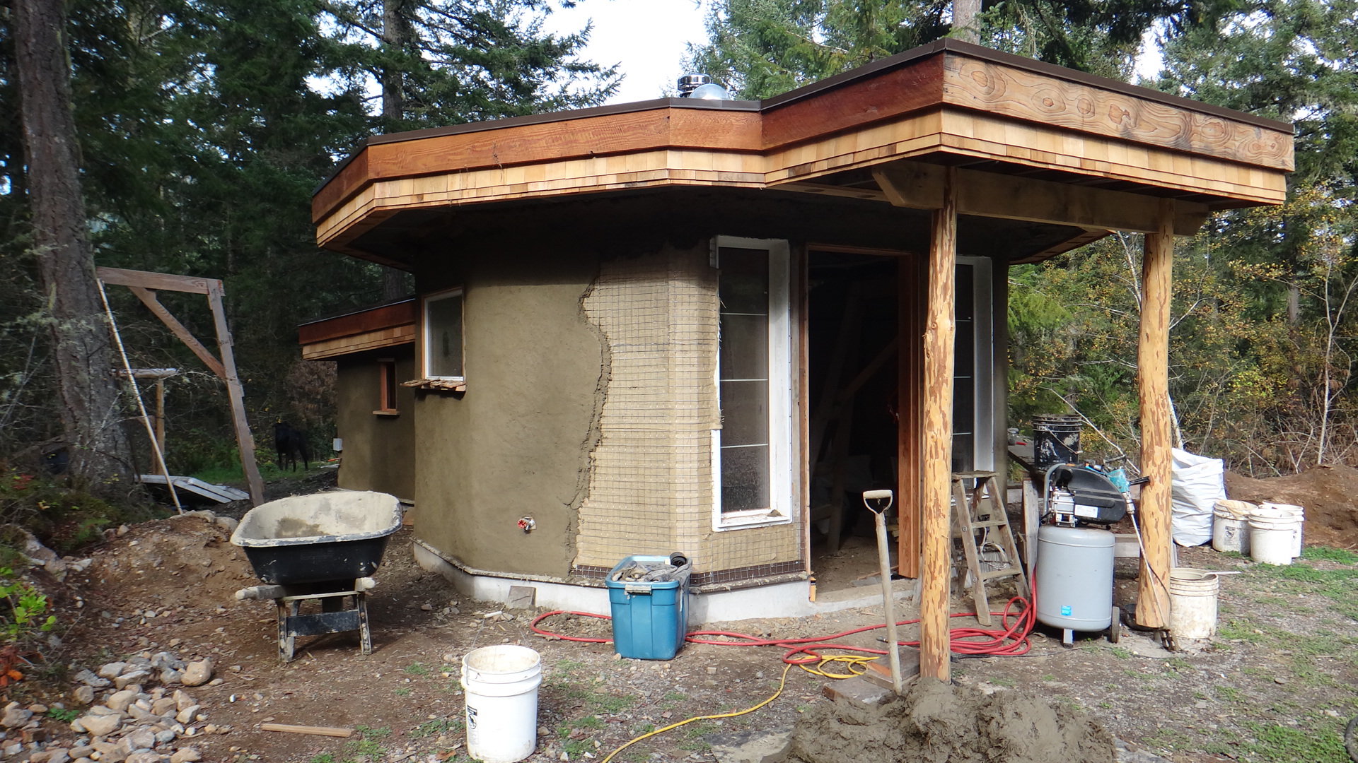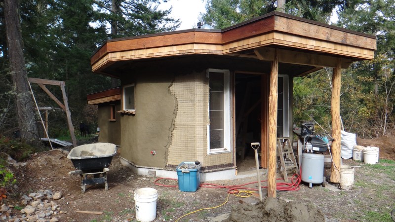 The eco-hut with curved plastered soffits.