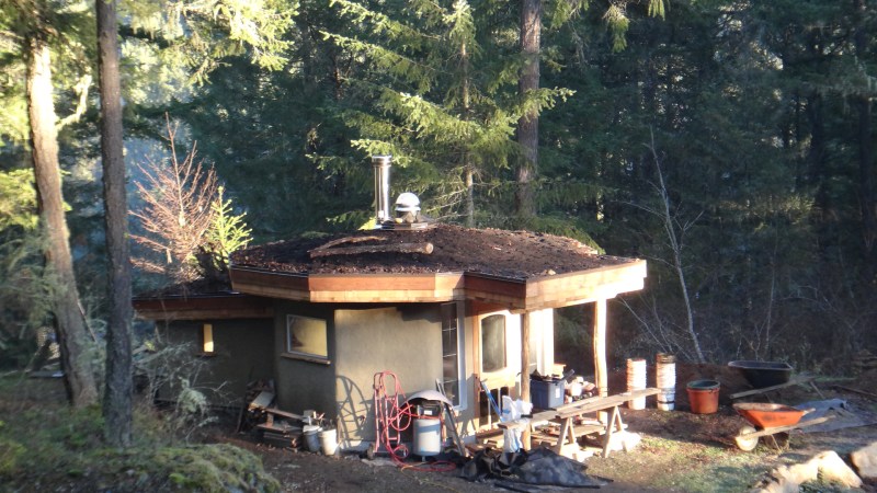 Our 3013 project – the eco-hut. Off-grid, octagonal self supporting roof, living roof, grey water, blown cellulose with earth and lime plasters, kitchen, wood stove, thermosiphon/solar hot water heating. A true tiny house.