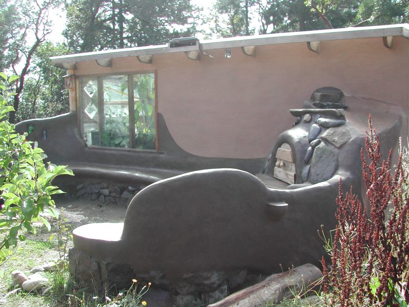 Eco-Sense greenhouse is partially heated in the winter when the cob oven is fired up every two weeks