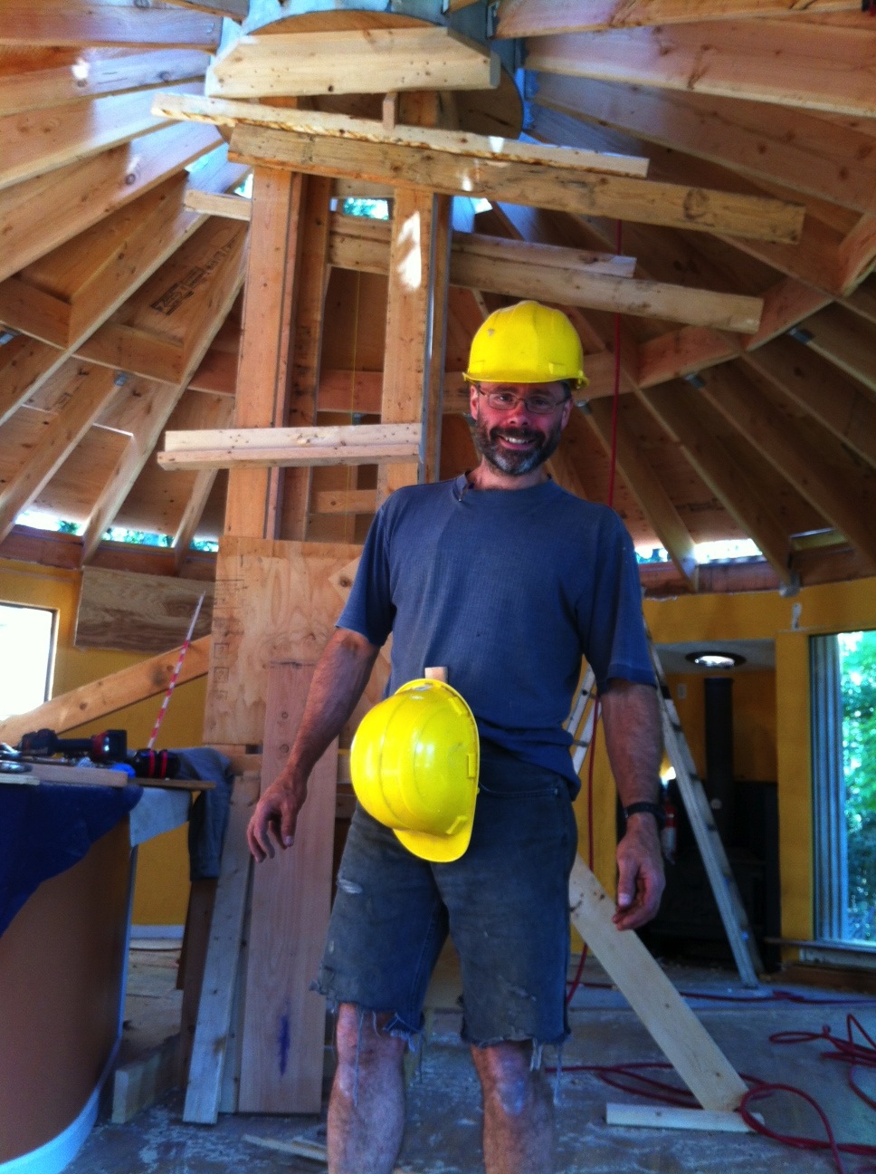 It might be funny, but we take safety seriously. The Chicher residence in Saanich was almost a complete rebuild of a double 20 sided wooden yurt with two complete roof system replacements, earthen floor, replaced wall sections… this job sold me on circular roofs.