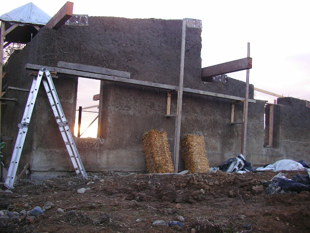 Gabor residence – this was the tallest one day lift – a 5′ lift located behind the aluminum ladder. This is a 16 foot tall load bearing cob wall.