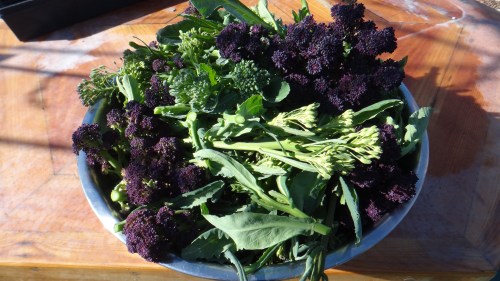 Winter purple sprouting broccoli seedlings in 1 gal pots. For sale in the nursery. $4. Keep in pot in partial shade and water and then plant out in July for late winter purple broccoli shoots. (This is what I do and it seems to work). It’s never too early to start planning your winter garden.